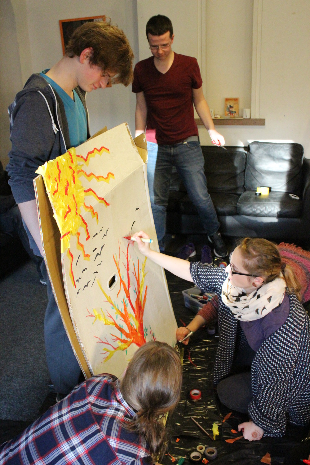 »Freiräume«- so lautet das diesjährige Motto der .lkj) Sachsen-Anhalt e.V. Vielfältige Umsetzung findet es auch auf den Seminaren der Freiwilligendienste Kultur und Bildung. So auch auf dem Zwischenseminar der Seminargruppe »Magenta«, das vom 22.-26. Februar in der Villa Jühling in Halle (Saale) stattfand. Allein die charmante Villa, die eine eigene Kläranlage besitzt und umgeben von einem Waldstück liegt, bietet allerlei Freiräume, um sich auszutoben. »Neben dem Nachhaltigkeitsgedanken ist die Selbstversorgung eine der Besonderheiten der Villa«, erklärt die Koordinatorin und Seminarleiterin Nadia Boltes. Die 23 Jugendlichen, die fast alle seit September ein Freiwilliges Soziales Jahr Kultur bzw. seit kurzem einen Bundesfreiwilligendienst Flucht und Asyl in den unterschiedlichsten Einrichtungen in Sachsen-Anhalt ableisten, buken täglich frisches Brot und kochten vegetarisch. Das Zwischenseminar ist eines von insgesamt vier Seminaren, die die jungen Leute in ihrem Freiwilligenjahr besuchen. Neben einem Workshop zum Thema Sexualpädagogik, verschiedener Projektarbeiten und einem Kreativabend gab es dann am Mittwoch gleich drei verschiedene künstlerische Workshops aus denen die Teilnehmer_innen wählen konnten: Forumtheater, Musik/Soundcollage und Graffiti/Tape-Art.